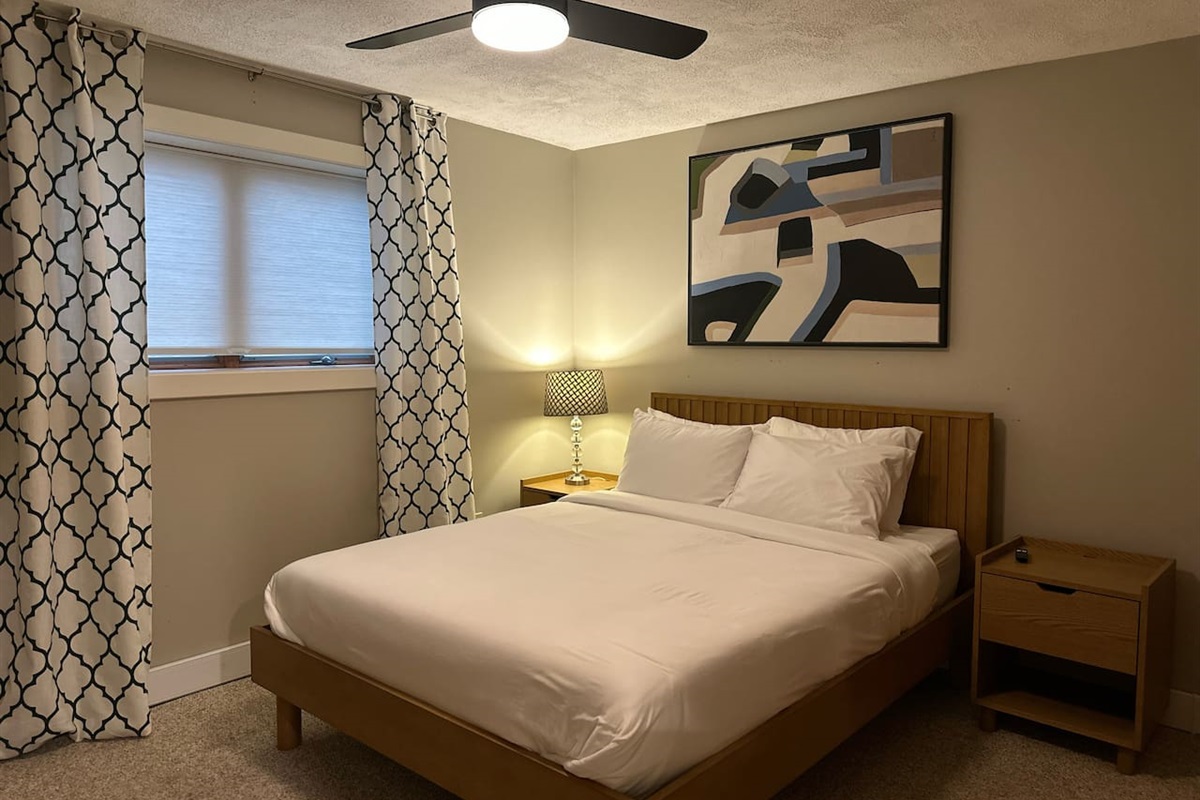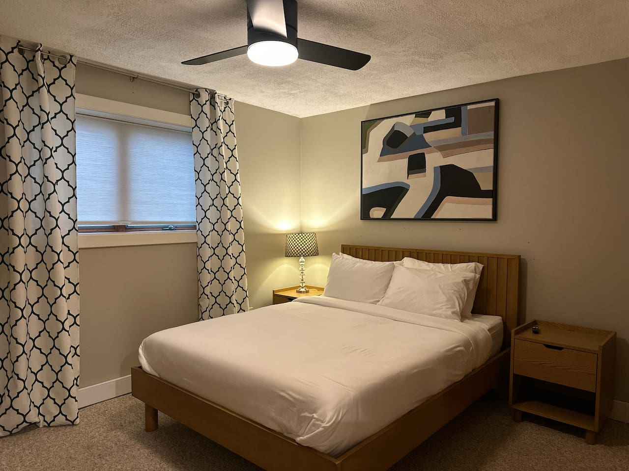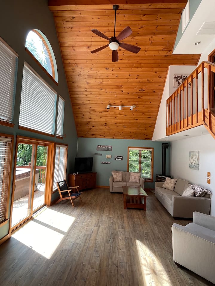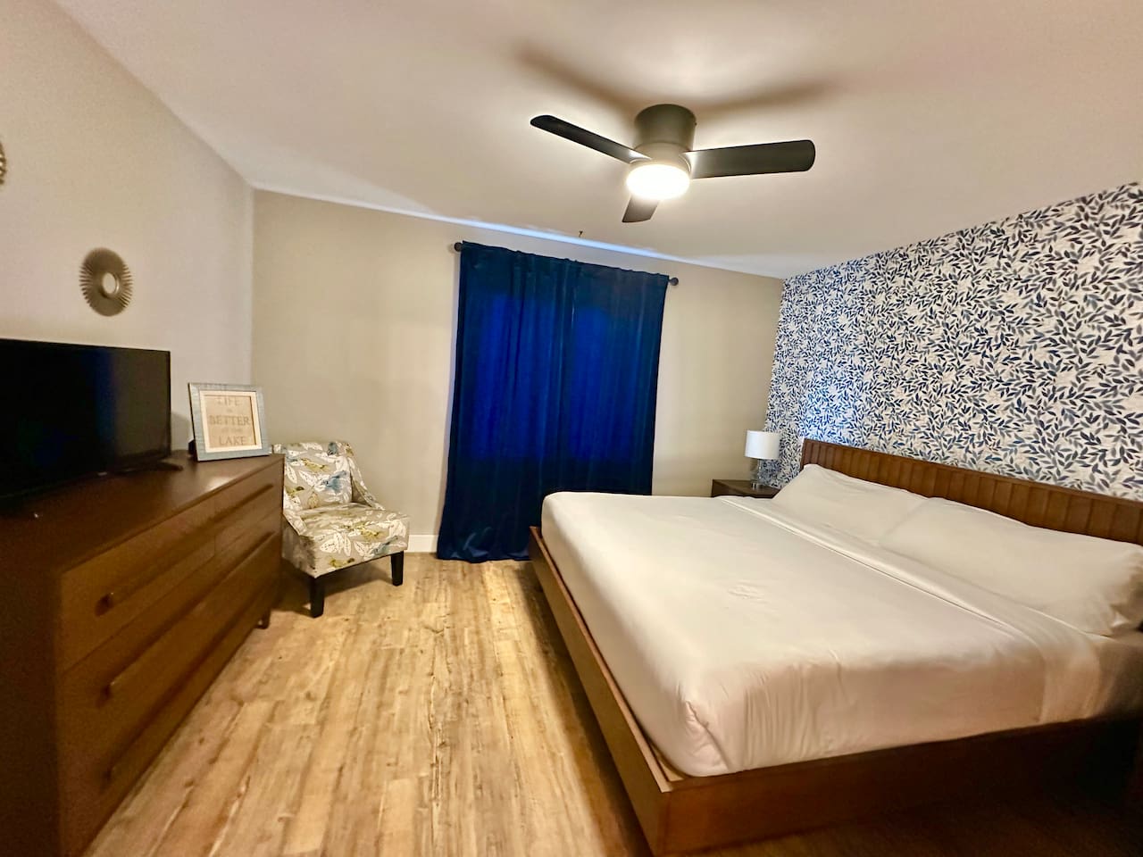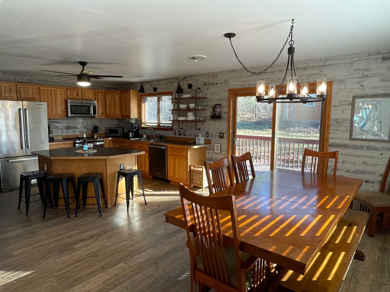4 Bedrooms • 3 Bathrooms 3 Baths • Sleeps 8-12From the house, it is a 5 minute walk (10 minutes with little ones or people with less mobility) down to the lake with access through Smith Park, which is across the road from our property. When in-season, the wade-in beach has lifeguards on duty, benches, grills, and plenty of space to grab a nap, catch up on a book, or splash around. For the braver souls, there is a dock to jump into the deeper water, too!