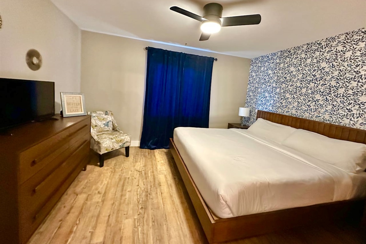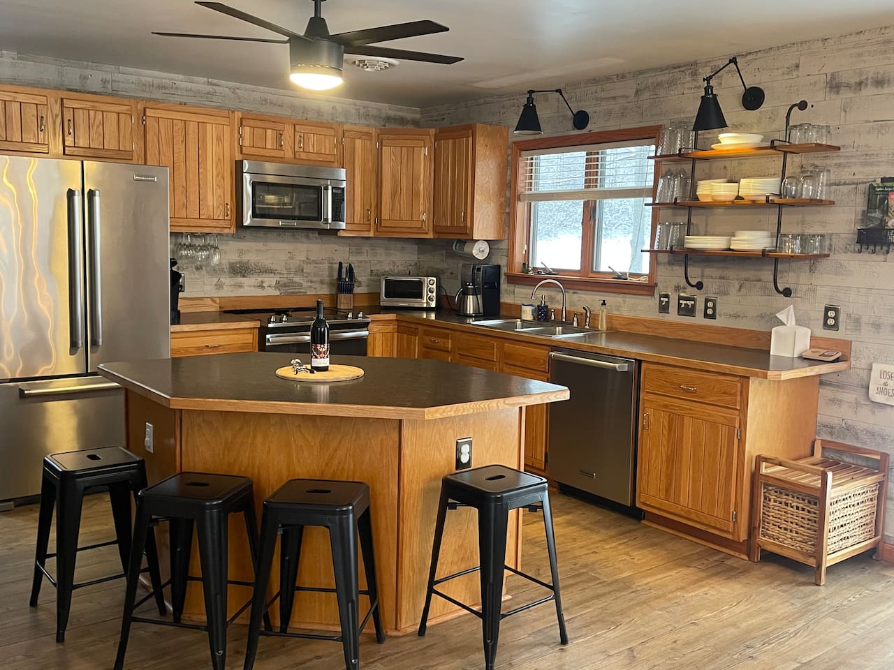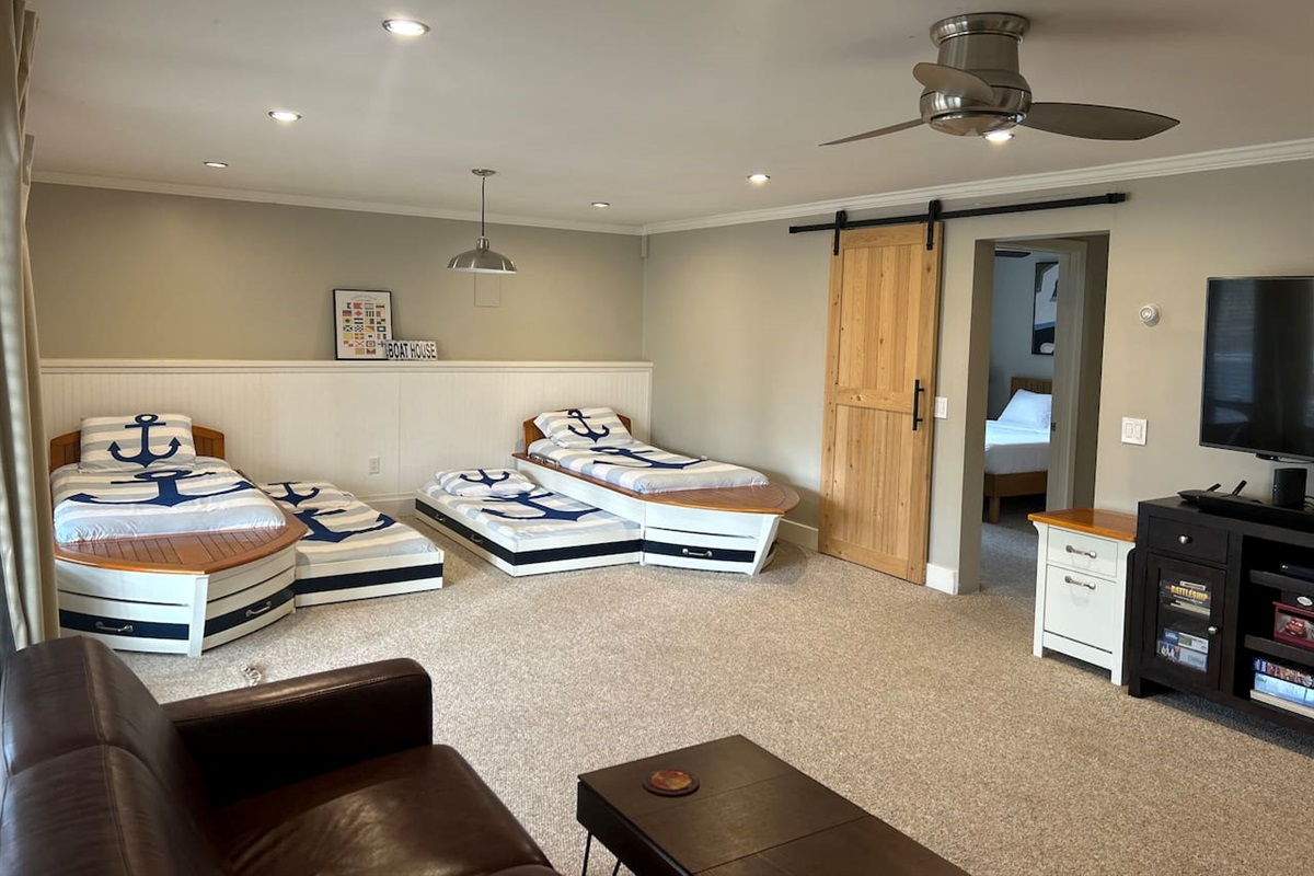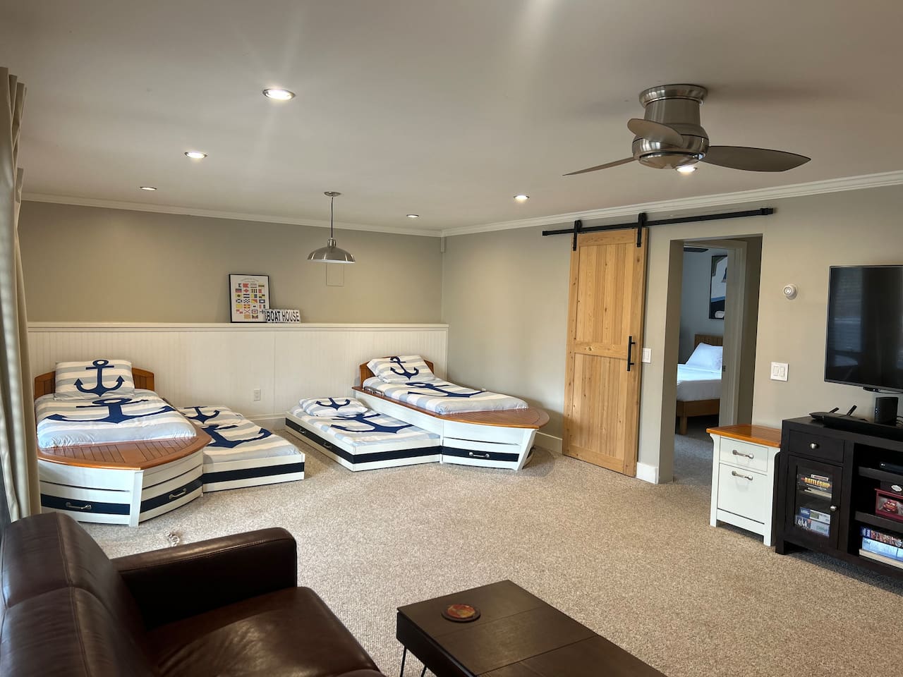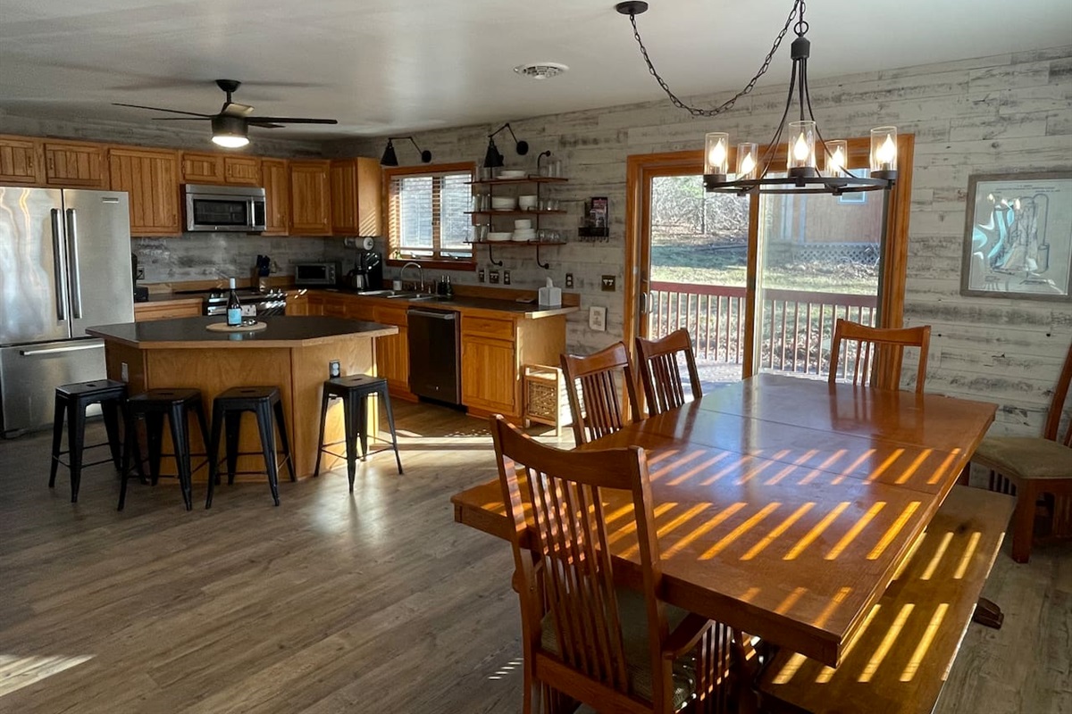 4 Bedrooms • 3 Bathrooms 3 Baths • Sleeps 8-12From the house, it is a 5 minute walk (10 minutes with little ones or people with less mobility) down to the lake with access through Smith Park, which is across the road from our property. When in-season, the wade-in beach has lifeguards on duty, benches, grills, and plenty of space to grab a nap, catch up on a book, or splash around. For the braver souls, there is a dock to jump into the deeper water, too!